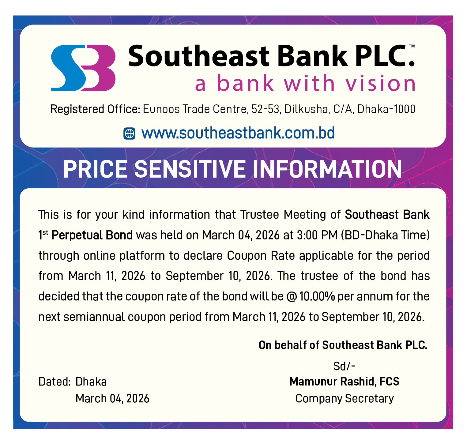 Declaration of Coupon Rate of Southeast Bank 1st Perpetual Bond.